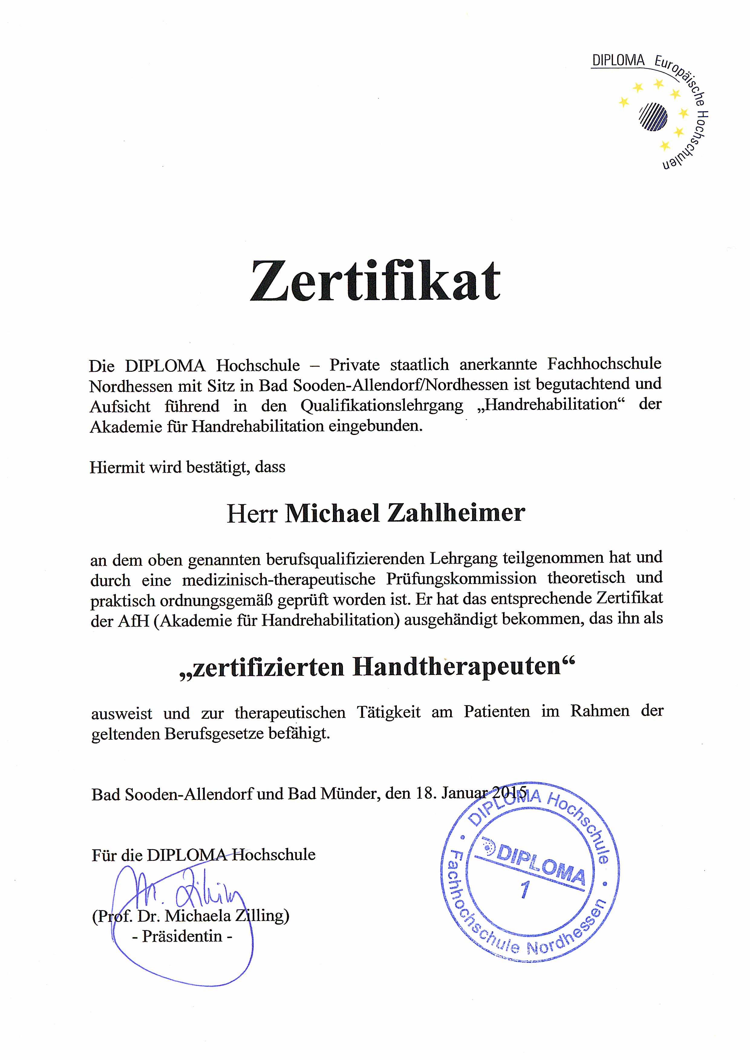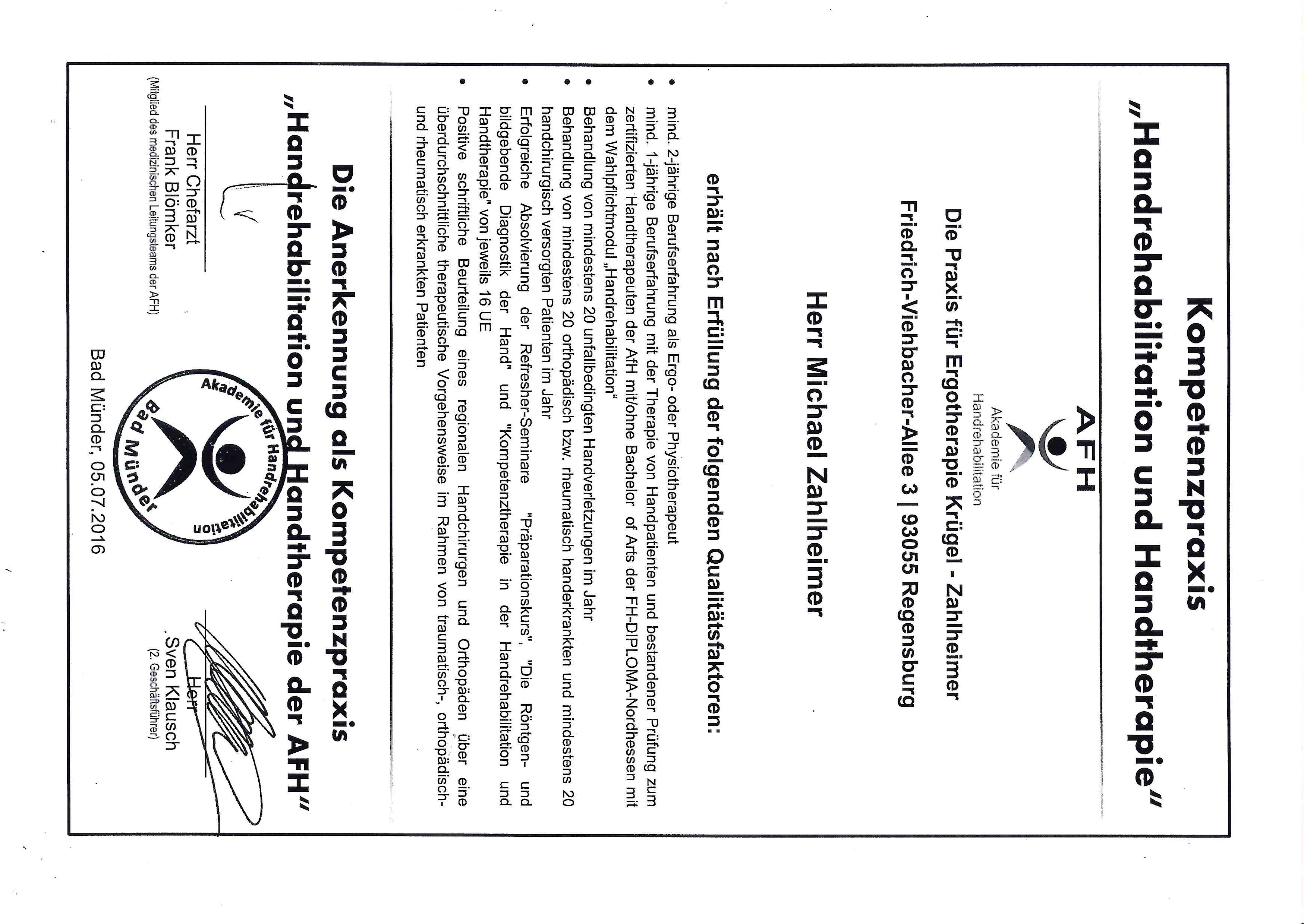 Unsere Praxis ist eine zertifizierte Schwerpunktpraxis für Handtherapie der AFH.